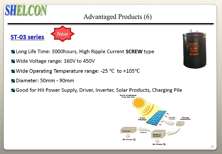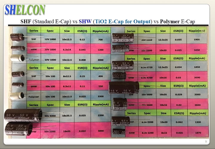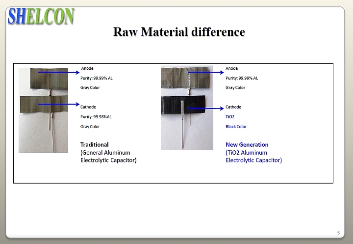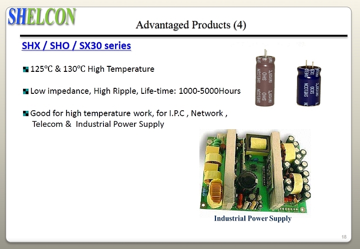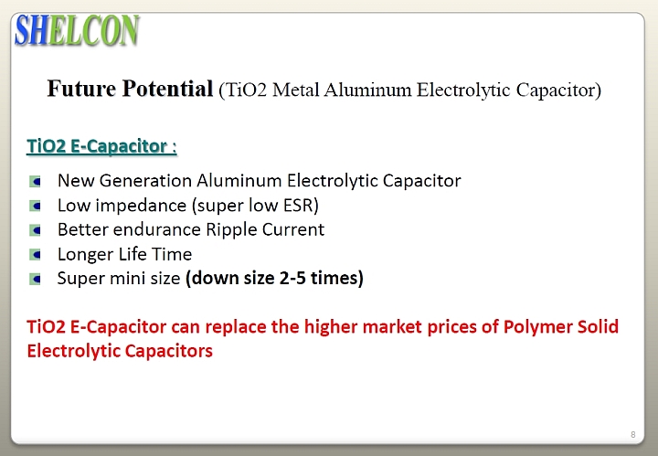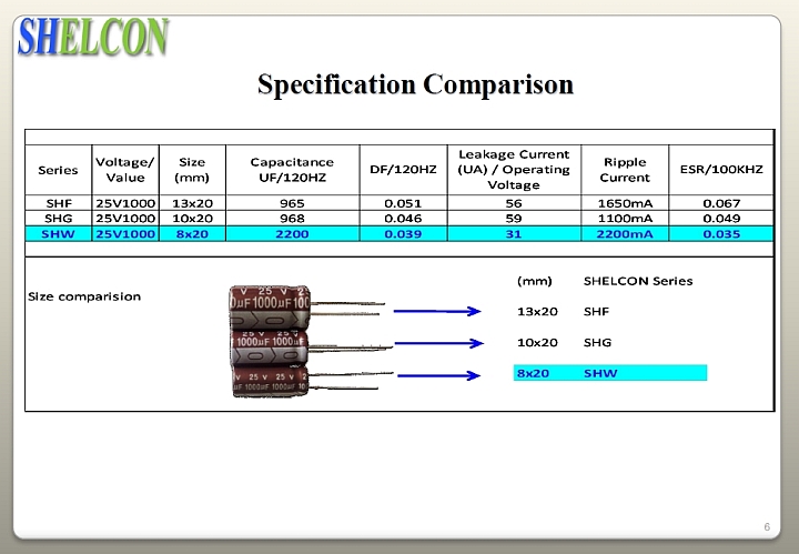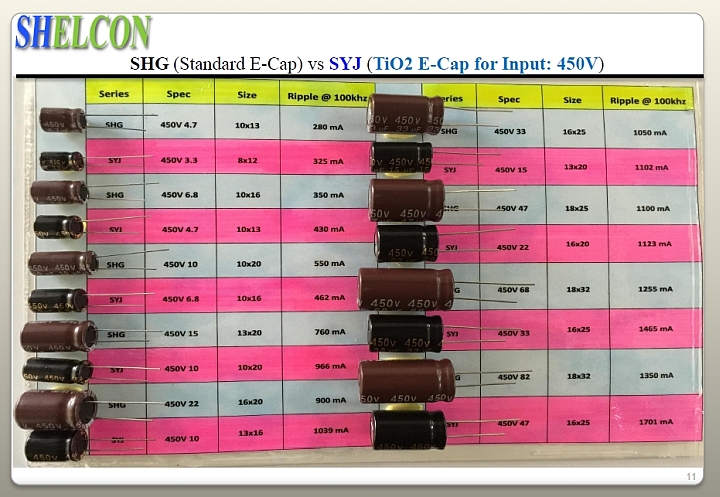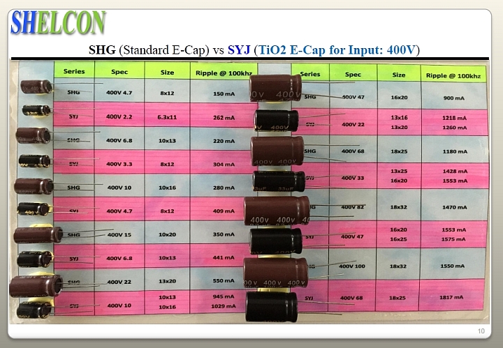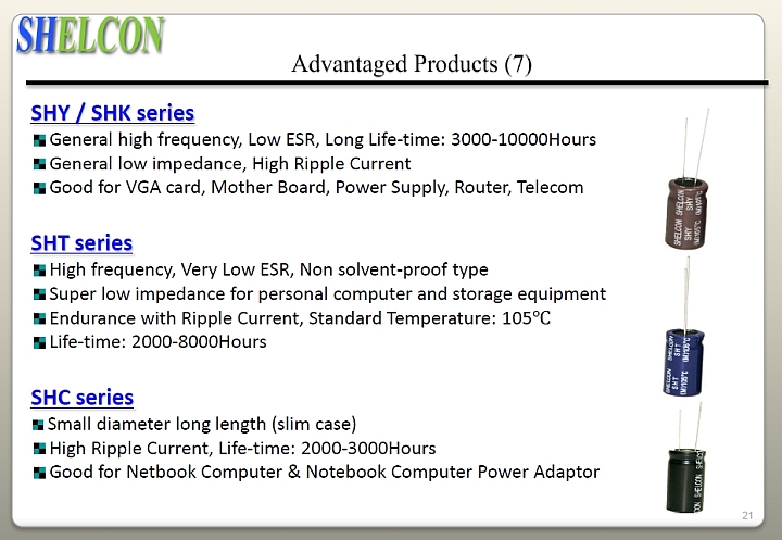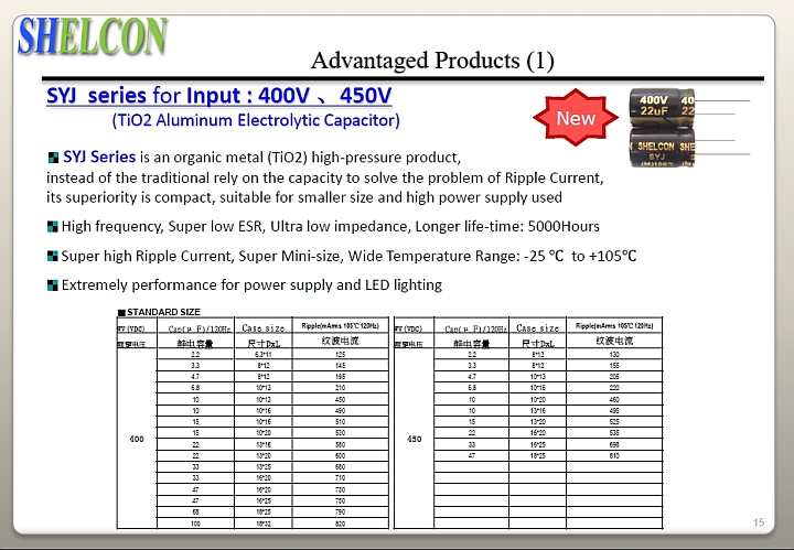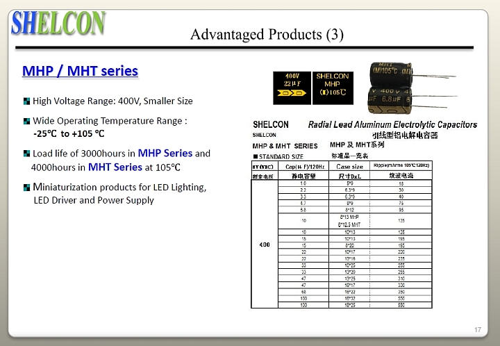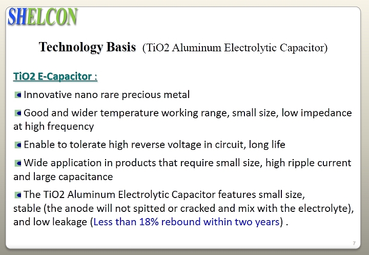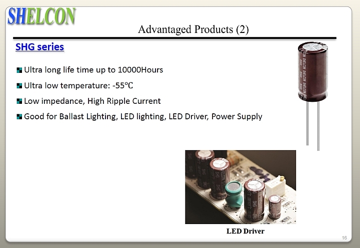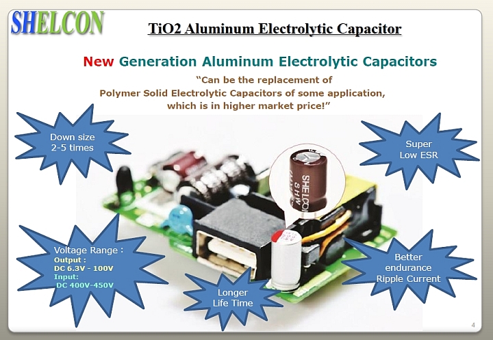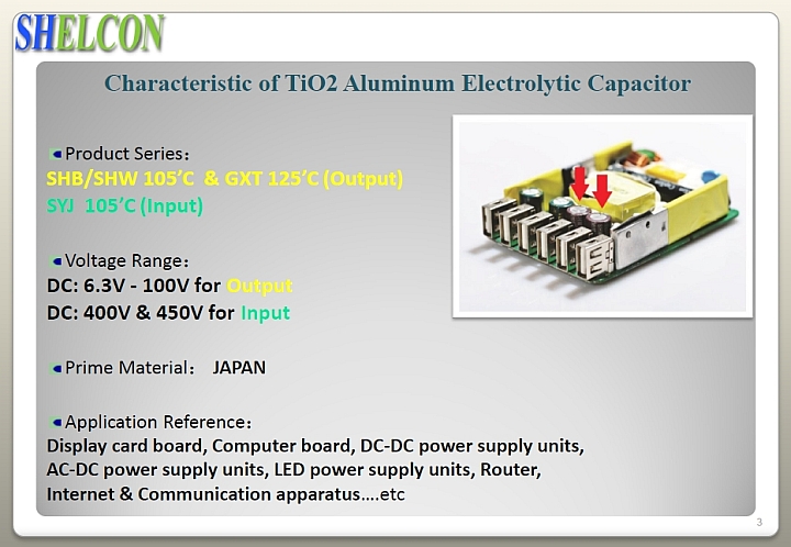 SHELCON has new generation Radial Aluminum Electrolytic Capacitors (E-CAP) named TiO2 Aluminum Electrolytic Capacitor (SHW / GXT / SYJ series). TiO2 Aluminum Electrolytic Capacitor is an innovative nano rare precious metal. It has excellent physical and chemical features, such as good and wide temperature working range, small size, low impedance at high frequency, enable to tolerate high reverse voltage in circuit, long life due to low deterioration to the surface of the TiO2 metal, able to sustain instantaneous high current surge, will not generate resistive coating. Wide applications in products that require small size, high ripple current and large capacitance. |